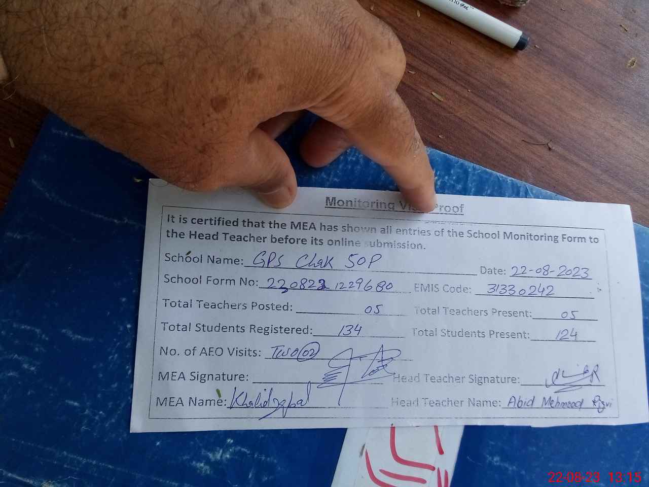 | Attendance Register | Head Teacher | MEA with School | Visit Proof |
