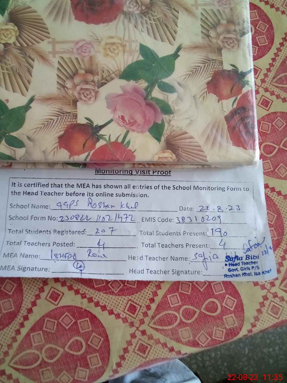 | Attendance Register | Head Teacher | MEA with School | Visit Proof |