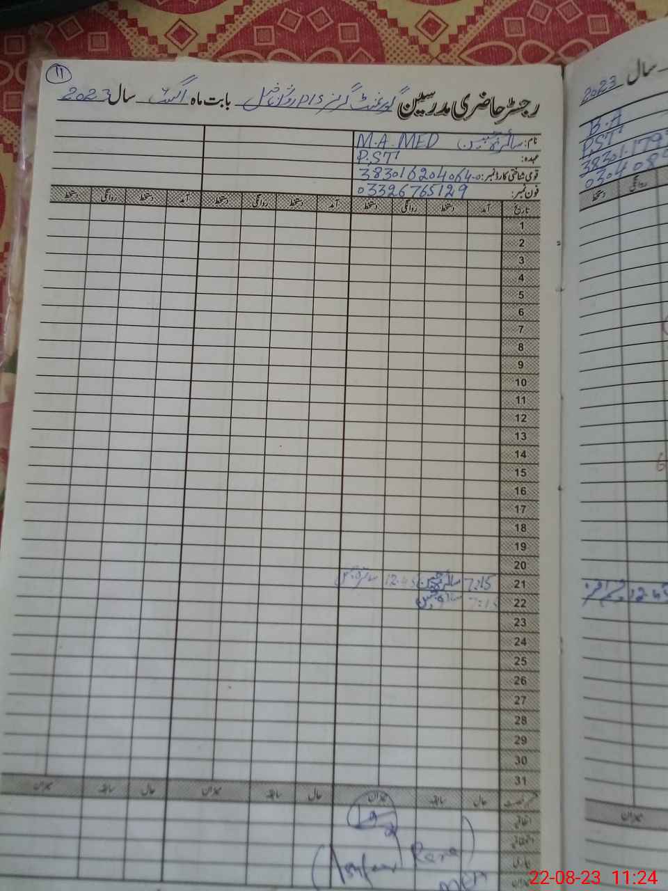 | Name: SA**** BI**** Designation: (School Headmaster's/Headmistress's) PST Phone/Cell Number: 03**** |