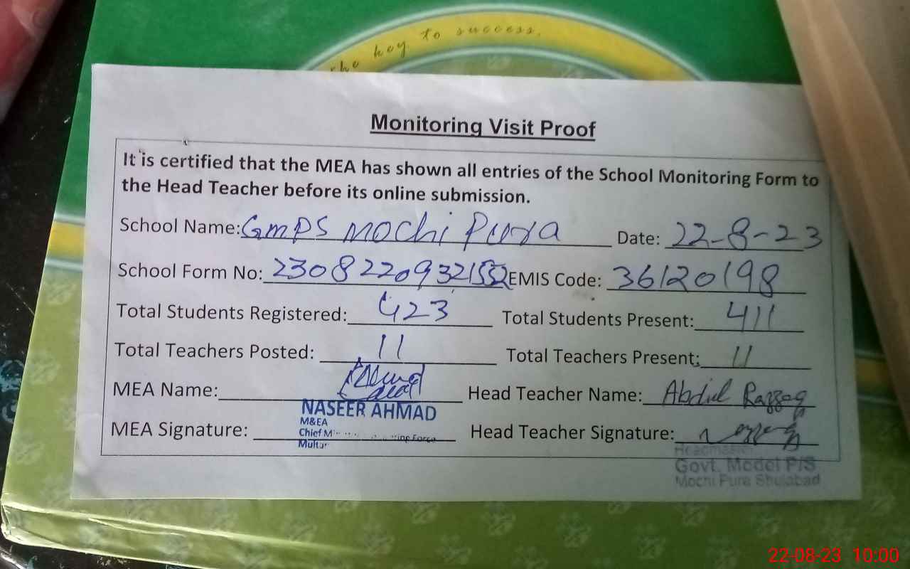| EMIS Code: 36120198 | Name of School: GMPS MOCHI PURA SHUJABAD DISTT. MULTAN | |||