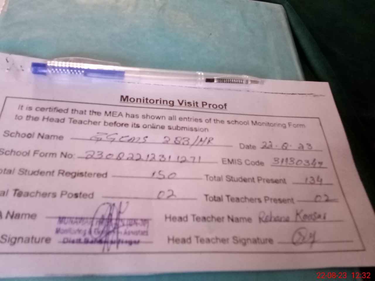 | Attendance Register | Head Teacher | MEA with School | Visit Proof |