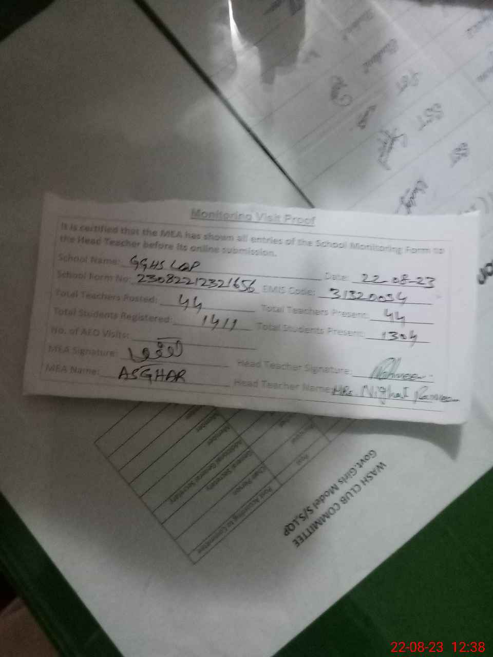 | Monitoring Date: 22-08-2023 | Start Time: 22-08-2023 12:06 PM | End Time: 22-08-2023 12:38 PM | Name of MEA: Mu**** As**** Sh**** | |