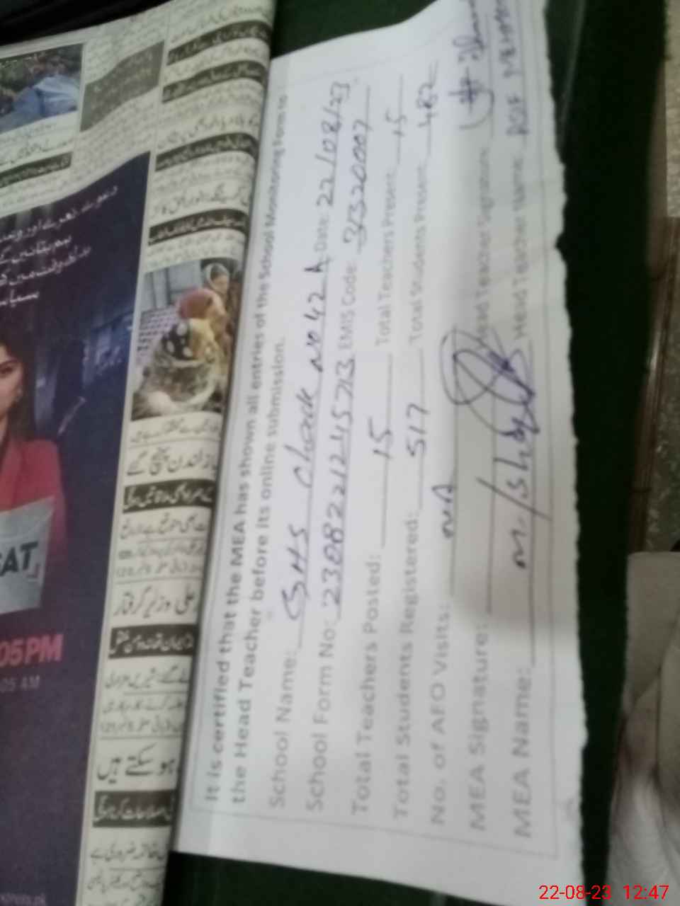 | Name: AS**** MA**** Designation: (School Headmaster's/Headmistress's) SST Phone/Cell Number: 03**** |
