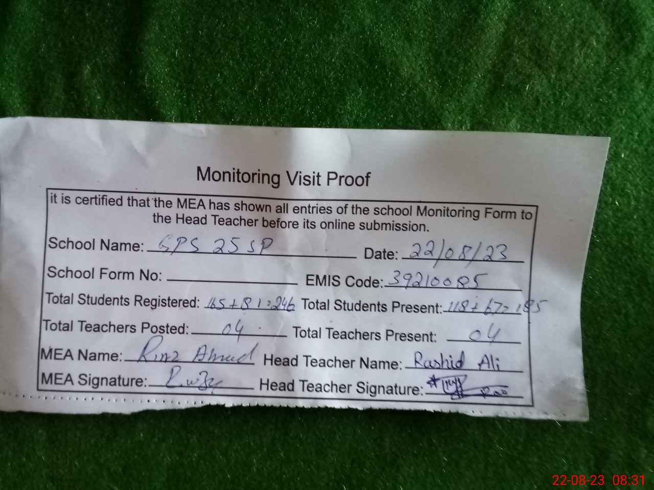 | Attendance Register | Head Teacher | MEA with School | Visit Proof |