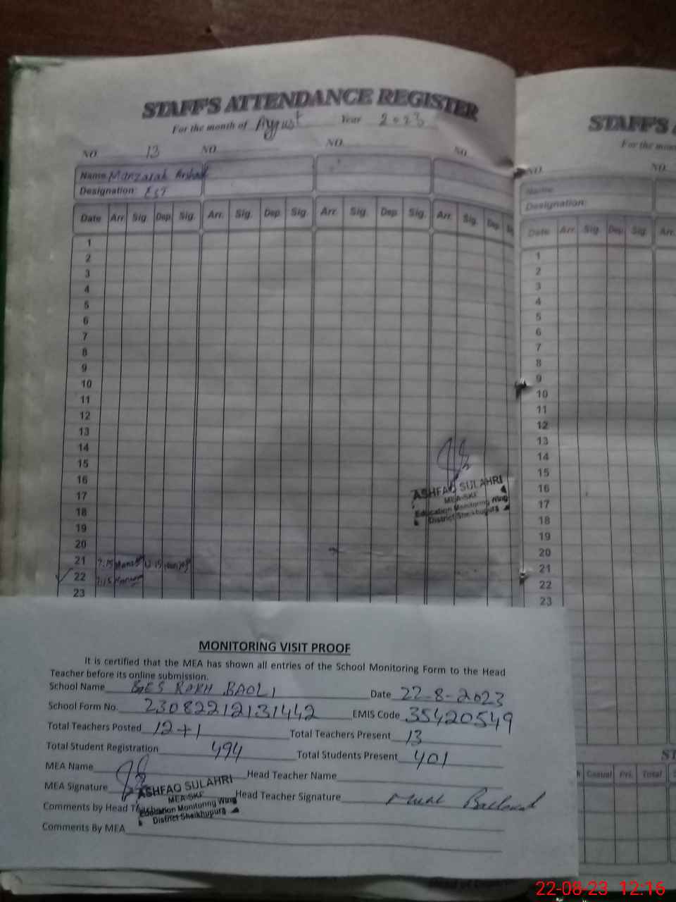 | Attendance Register | Head Teacher | MEA with School | Visit Proof |
