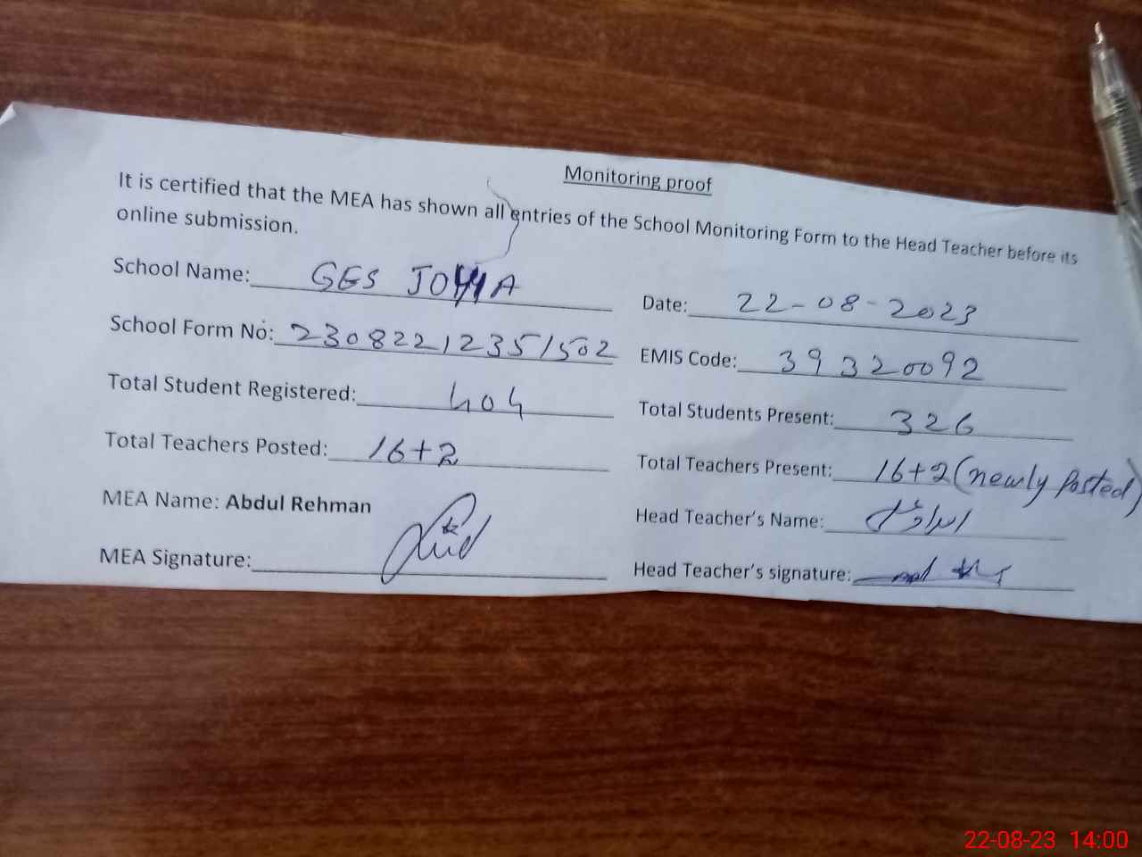 | Attendance Register | Head Teacher | MEA with School | Visit Proof |