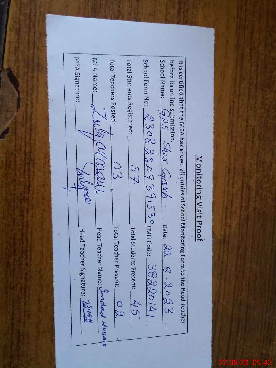 | Attendance Register | Head Teacher | MEA with School | Visit Proof |