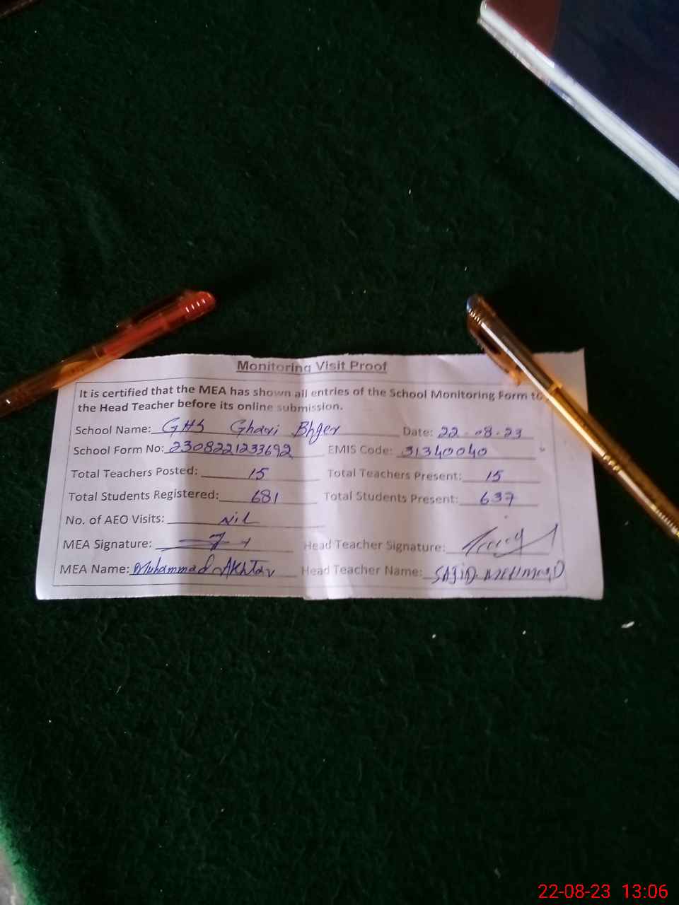 | Attendance Register | Head Teacher | MEA with School | Visit Proof |