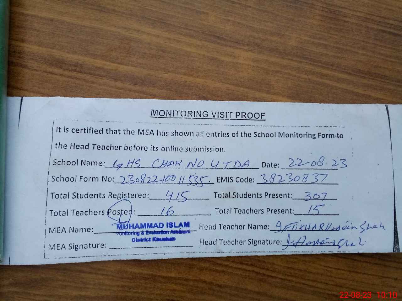 | EMIS Code: 38230837 | Name of School: GHS CHAK NO. 4 TDA | |||
