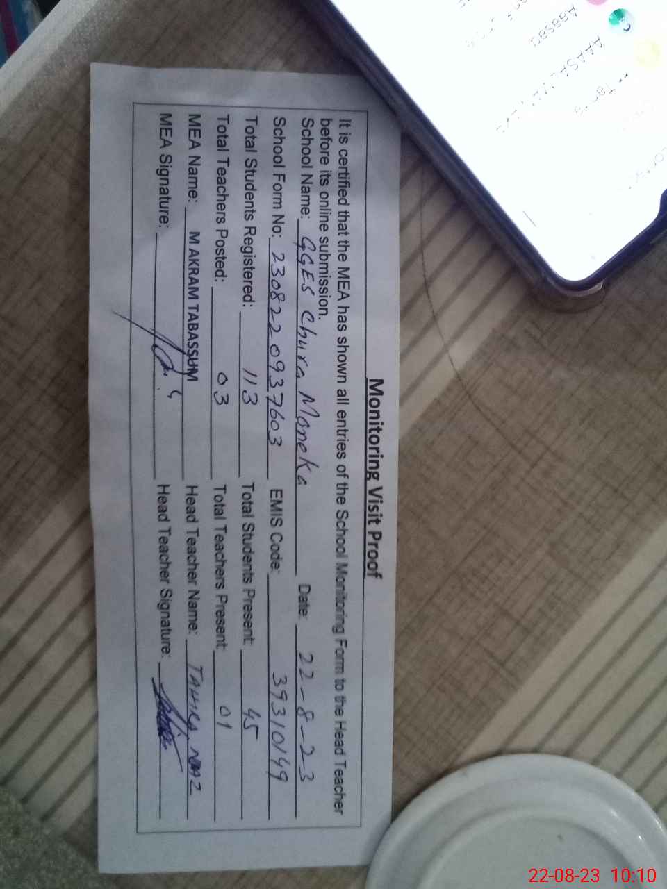 | Monitoring Date: 22-08-2023 | Start Time: 22-08-2023 09:37 AM | End Time: 22-08-2023 10:12 AM | Name of MEA: MU**** AK**** TA**** | |