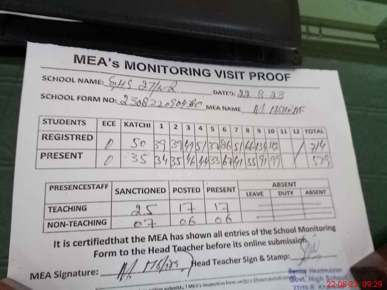 | Attendance Register | Head Teacher | MEA with School | Visit Proof |