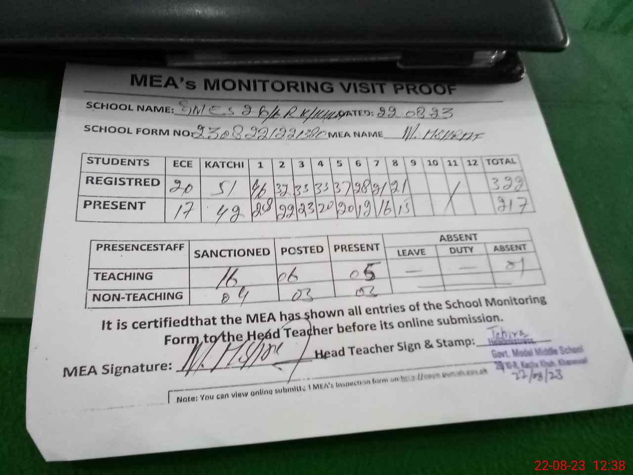 | Attendance Register | Head Teacher | MEA with School | Visit Proof |