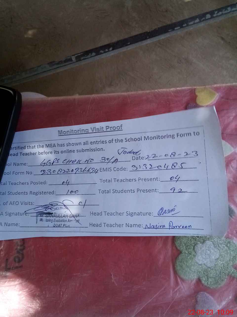 | Monitoring Date: 22-08-2023 | Start Time: 22-08-2023 09:35 AM | End Time: 22-08-2023 10:11 AM | Name of MEA: Mu**** Sa**** Ul**** Sa**** | |
