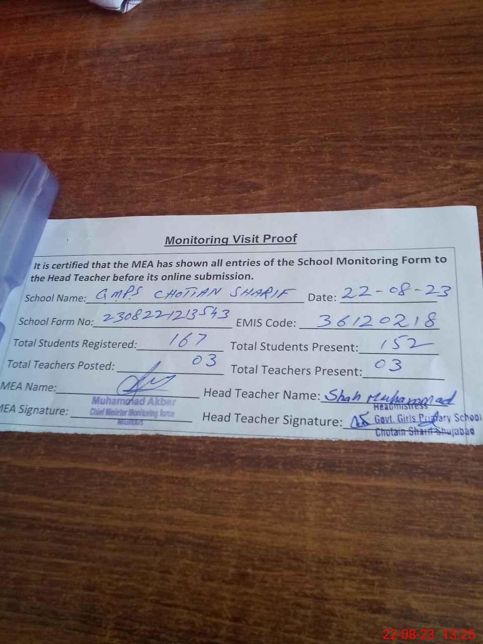 | Attendance Register | Head Teacher | MEA with School | Visit Proof |