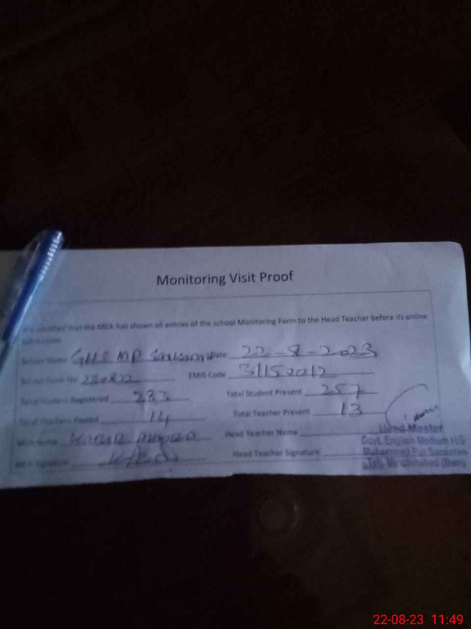 | Attendance Register | Head Teacher | MEA with School | Visit Proof |