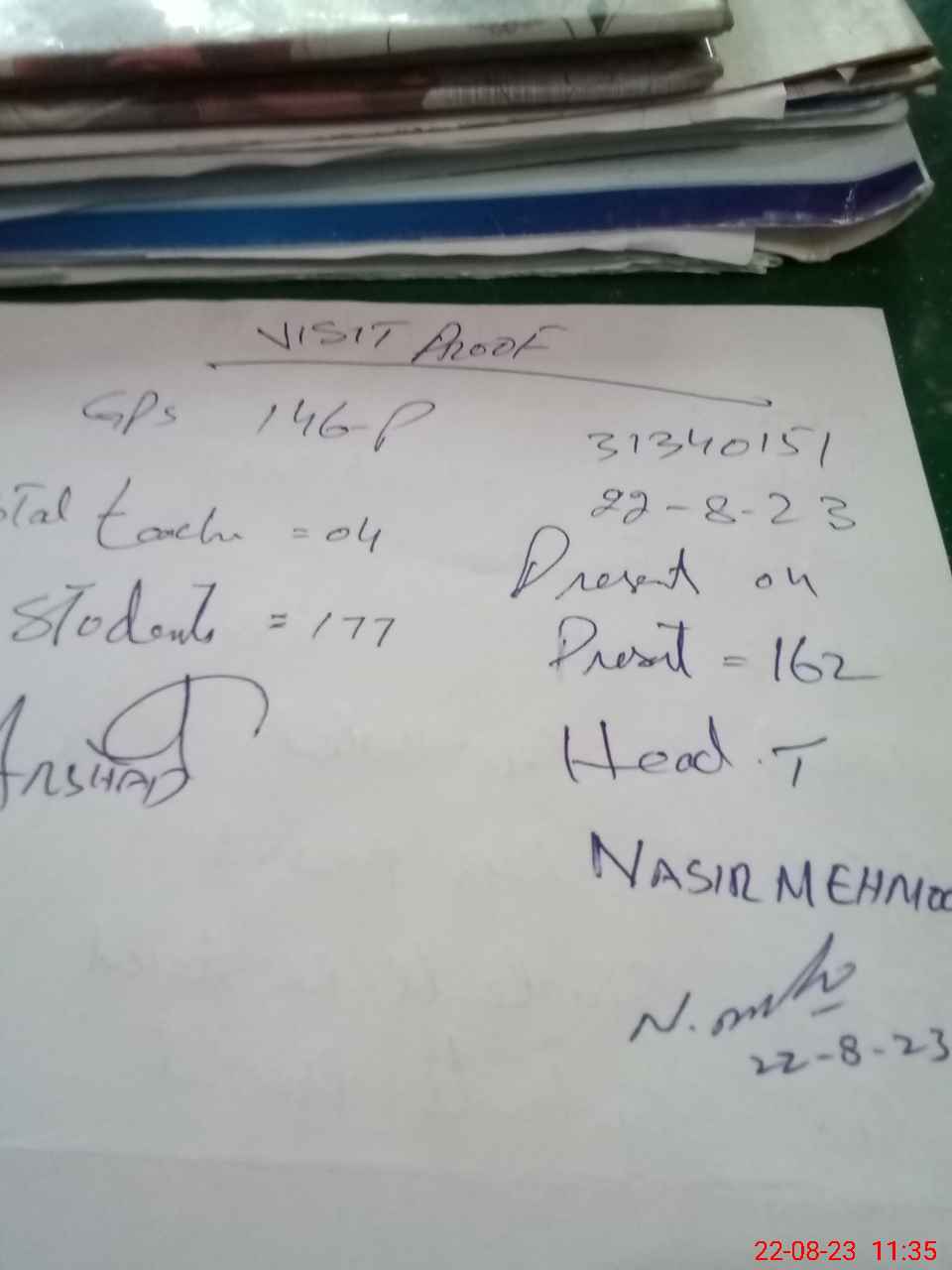 | Attendance Register | Head Teacher | MEA with School | Visit Proof |