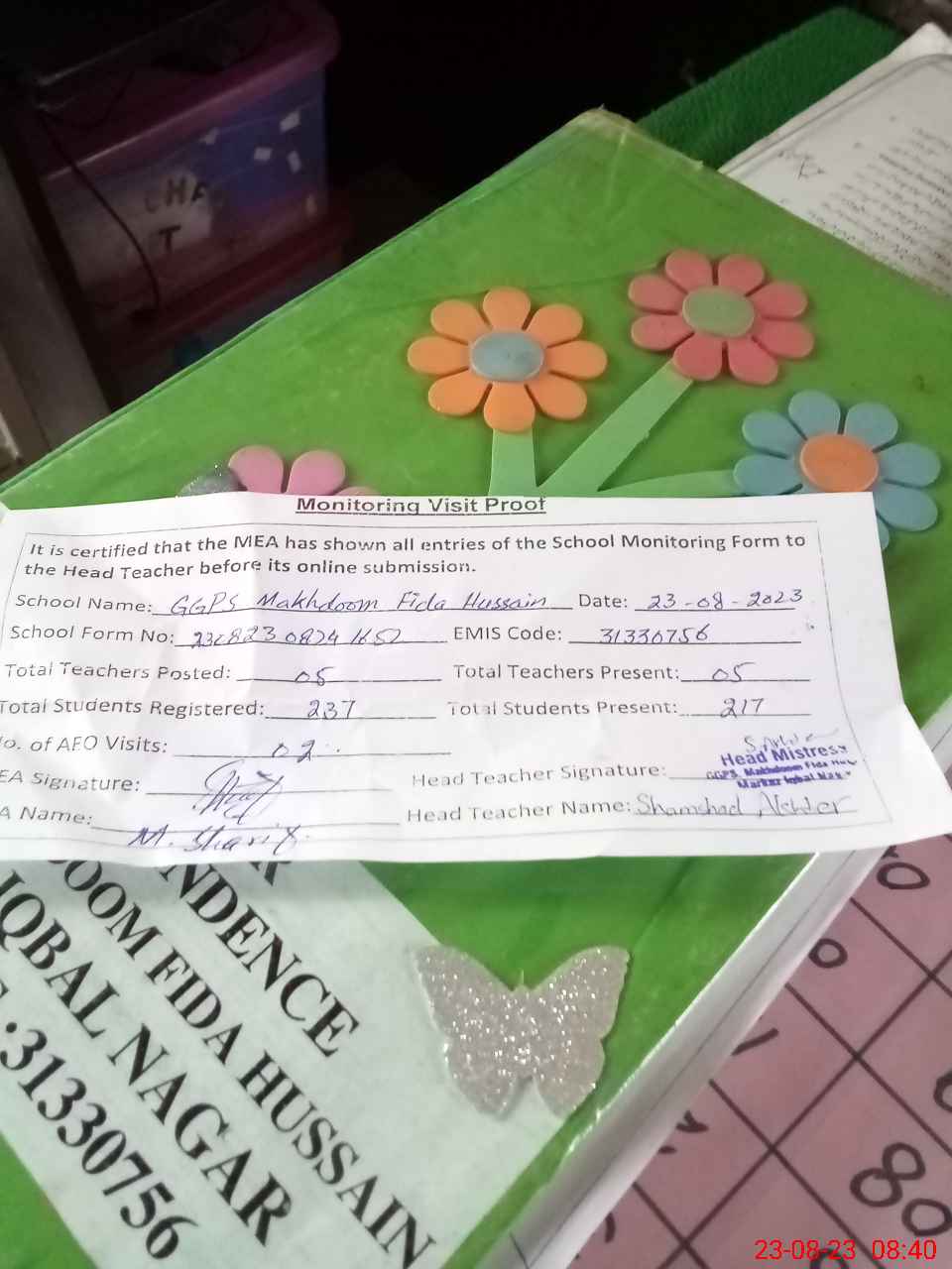 | Attendance Register | Head Teacher | MEA with School | Visit Proof |