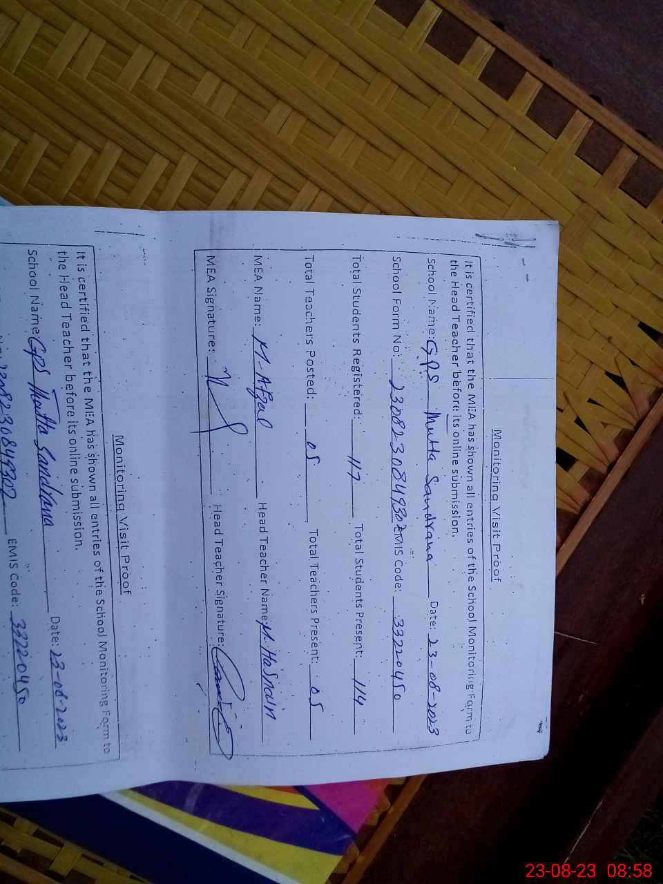 | Attendance Register | Head Teacher | MEA with School | Visit Proof |