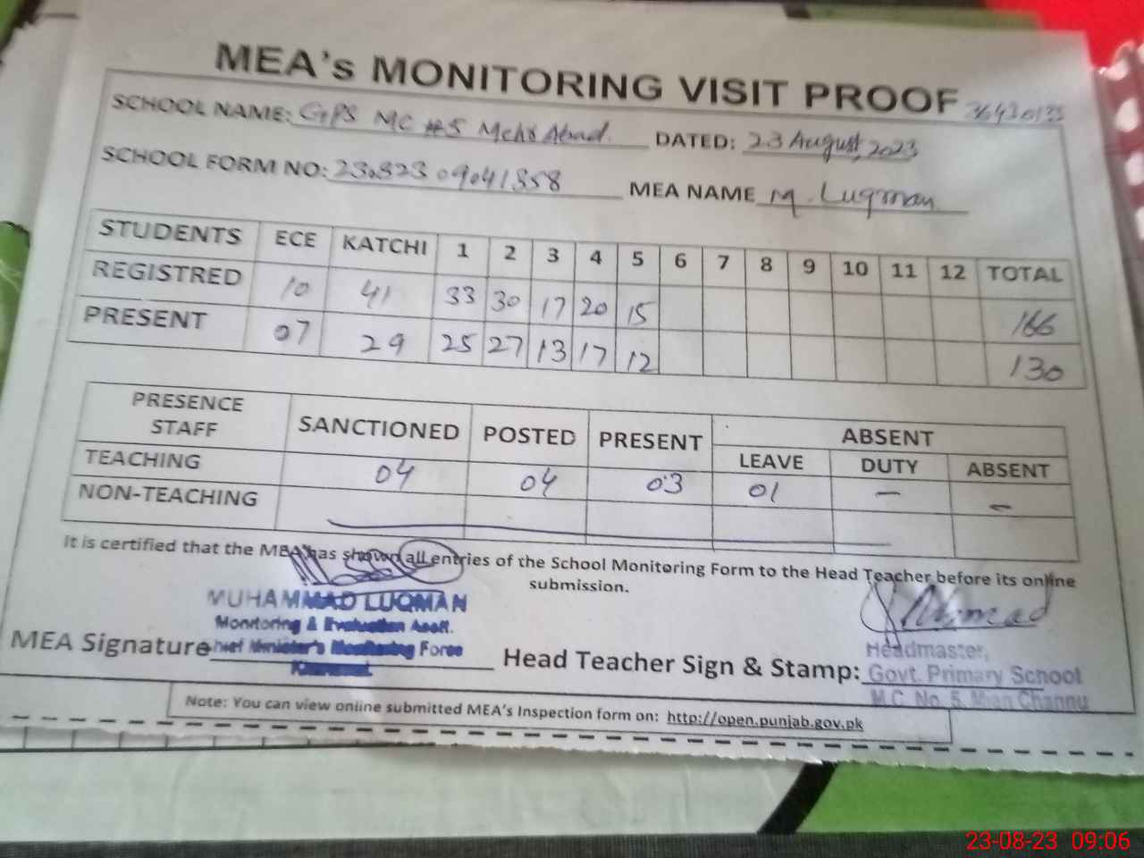 | Attendance Register | Head Teacher | MEA with School | Visit Proof |