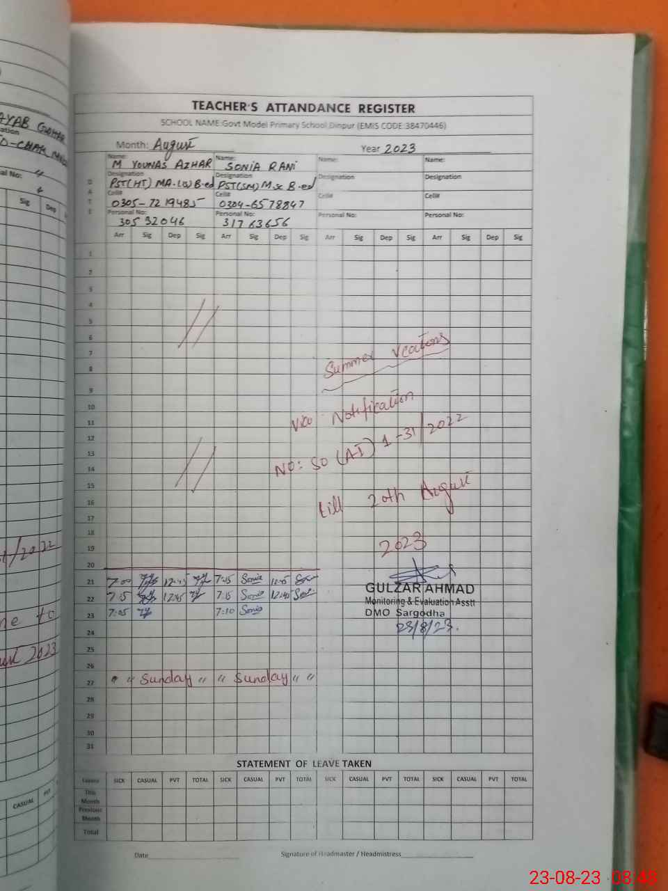 | Name: MU**** YO**** Designation: (School Headmaster's/Headmistress's) PST Phone/Cell Number: 03**** |