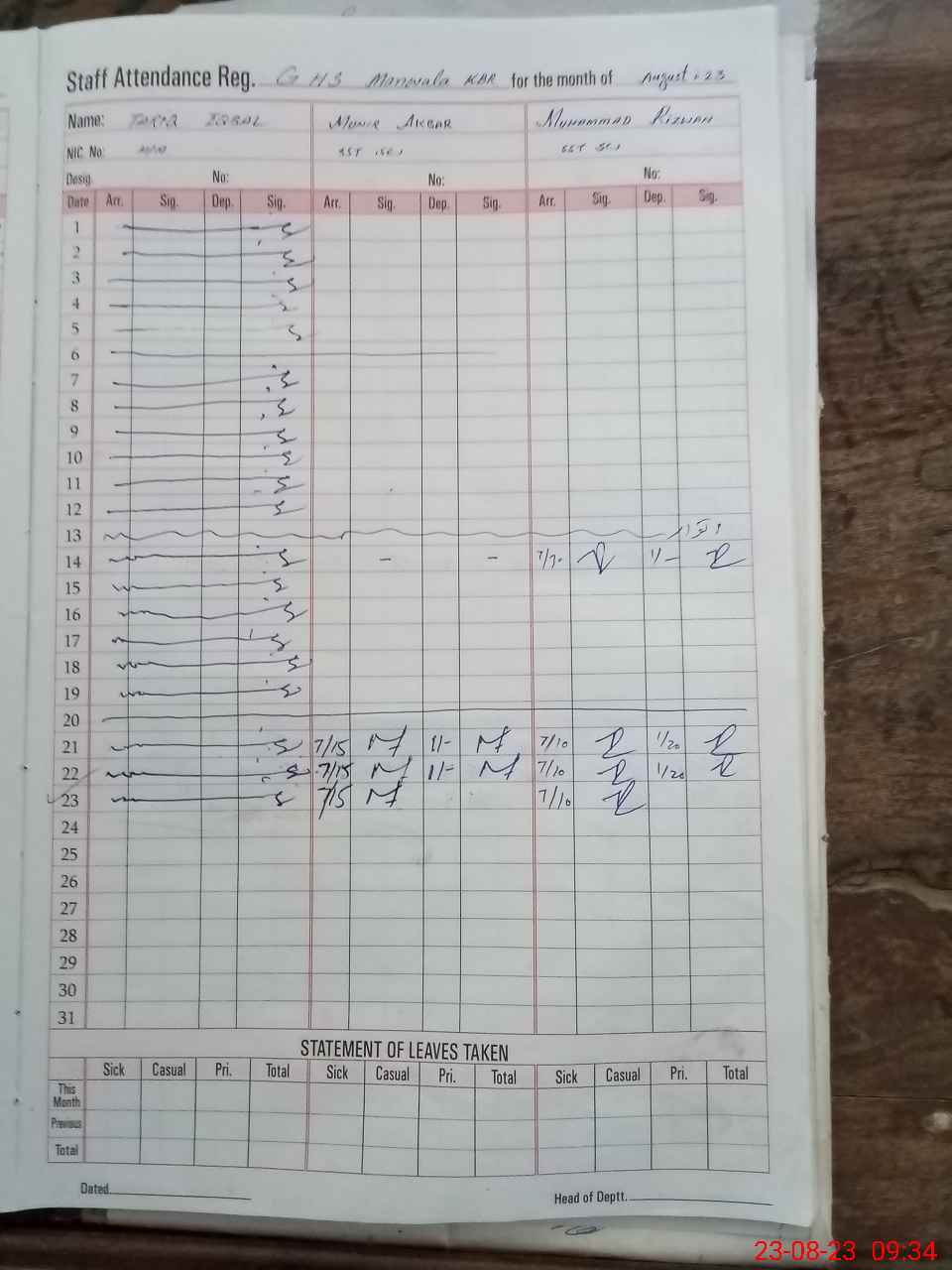 | CNIC | Full Name | Designation | R/C | Absence During Last Calender Month |