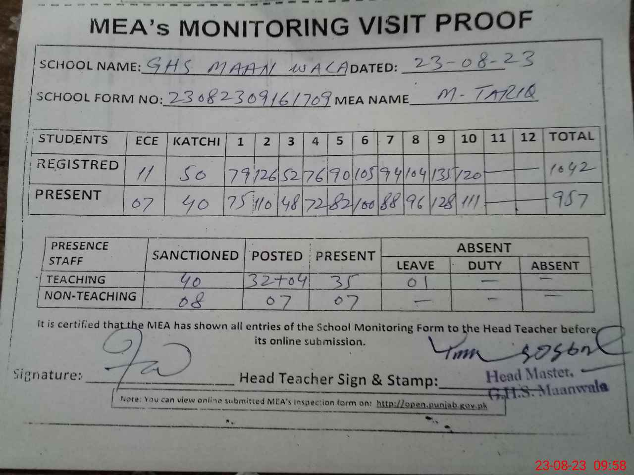 | Attendance Register | Head Teacher | MEA with School | Visit Proof |