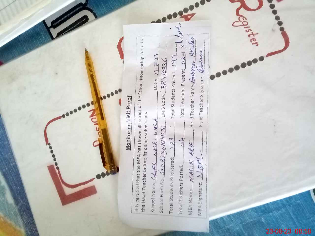 | Attendance Register | Head Teacher | MEA with School | Visit Proof |