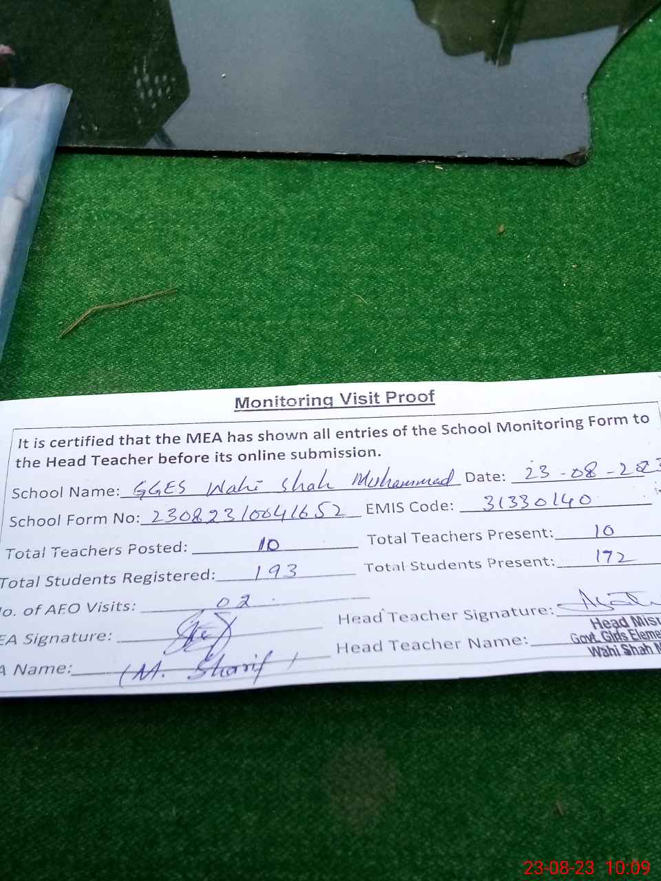 | Monitoring Date: 23-08-2023 | Start Time: 23-08-2023 08:46 AM | End Time: 23-08-2023 10:10 AM | Name of MEA: Mu**** Sh**** | |