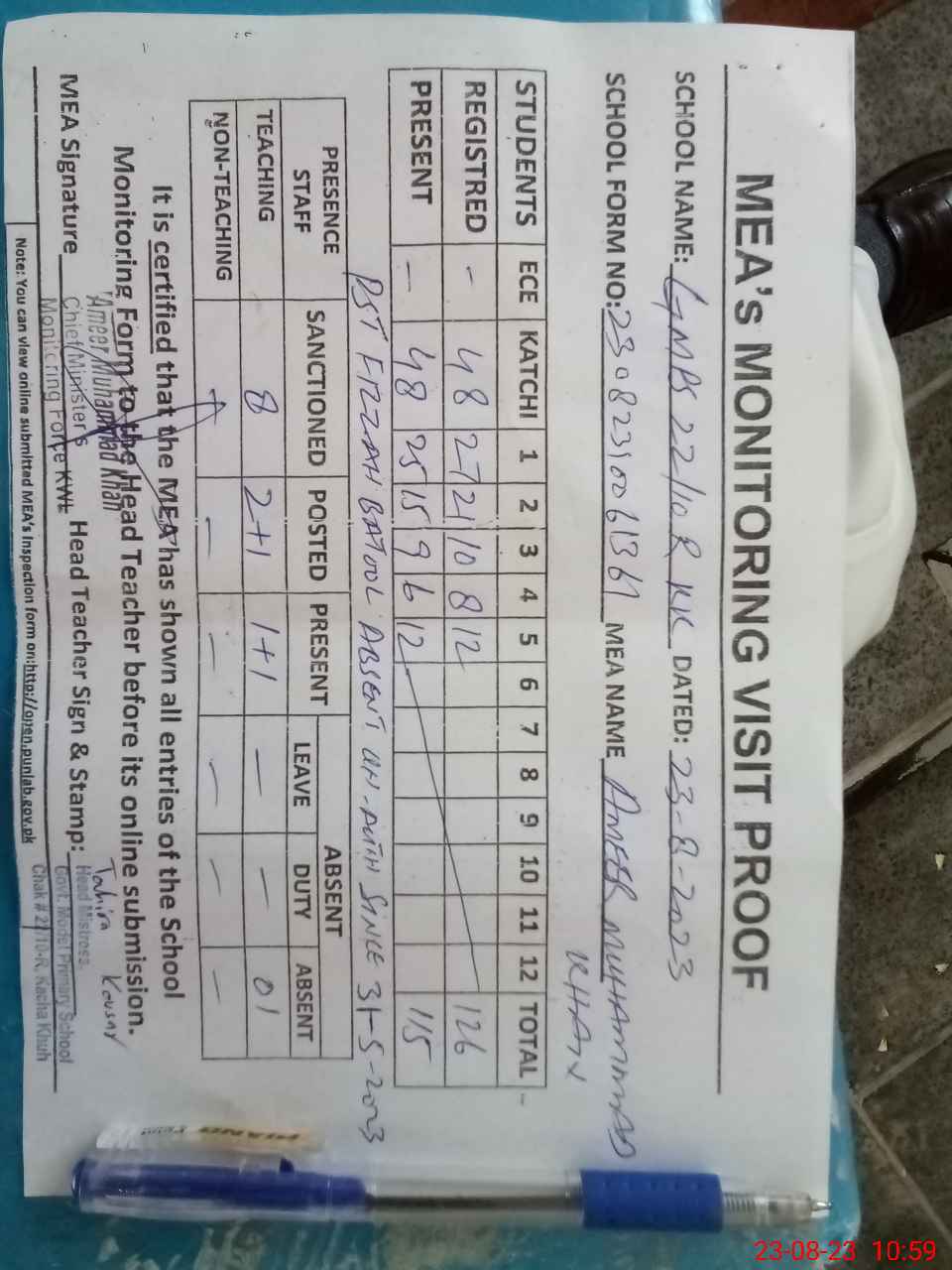 | Attendance Register | Head Teacher | MEA with School | Visit Proof |
