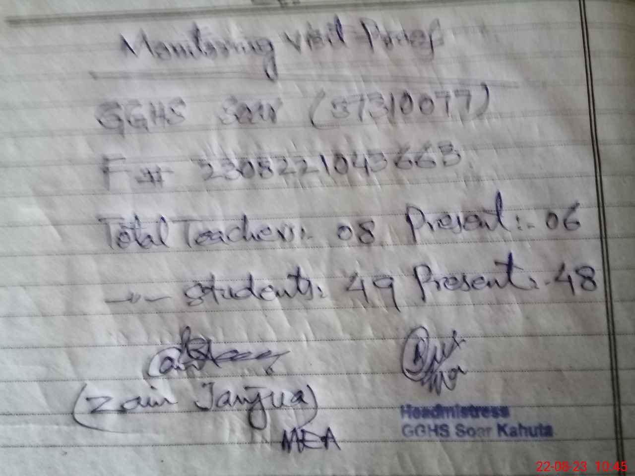 | Monitoring Date: 22-08-2023 | Start Time: 22-08-2023 10:03 AM | End Time: 22-08-2023 10:47 AM | Name of MEA: ZA**** ULAB**** (R**** | |