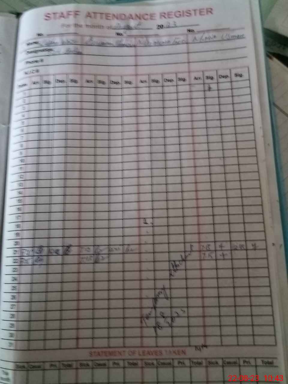| CNIC | Full Name | Designation | R/C | Absence During Last Calender Month |