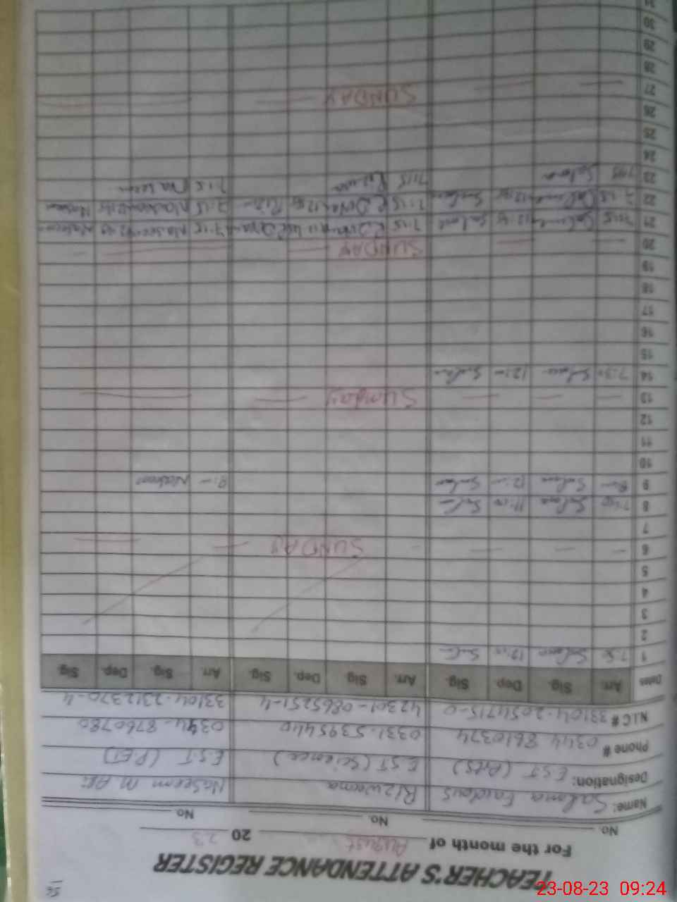 | Name: SA**** FI**** Designation: (School Headmaster's/Headmistress's) EST Phone/Cell Number: 03**** |