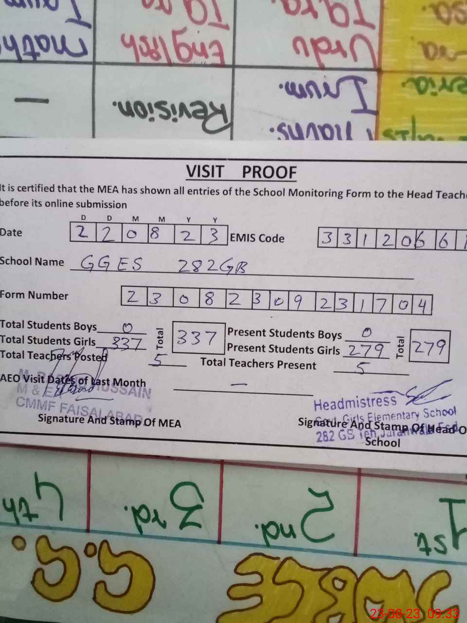 | Attendance Register | Head Teacher | MEA with School | Visit Proof |