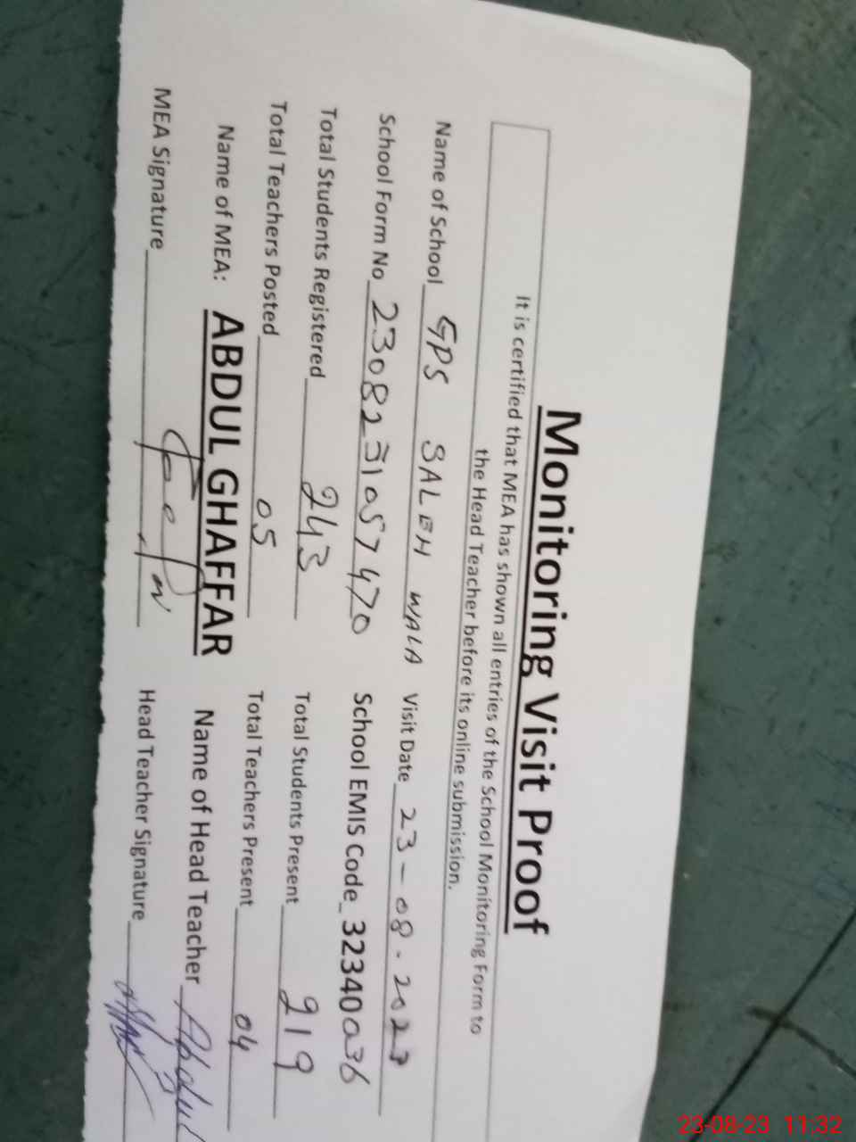 | Attendance Register | Head Teacher | MEA with School | Visit Proof |