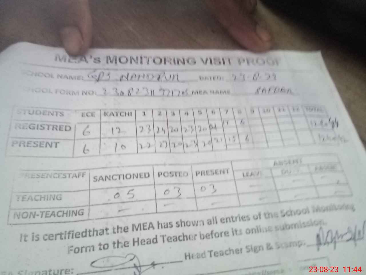 | Attendance Register | Head Teacher | MEA with School | Visit Proof |
