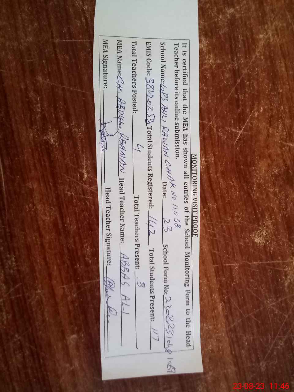 | Attendance Register | Head Teacher | MEA with School | Visit Proof |