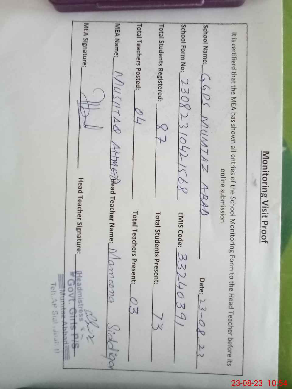| EMIS Code: 33240391 | Name of School: GGPS MUMTAZ ABAD | |||