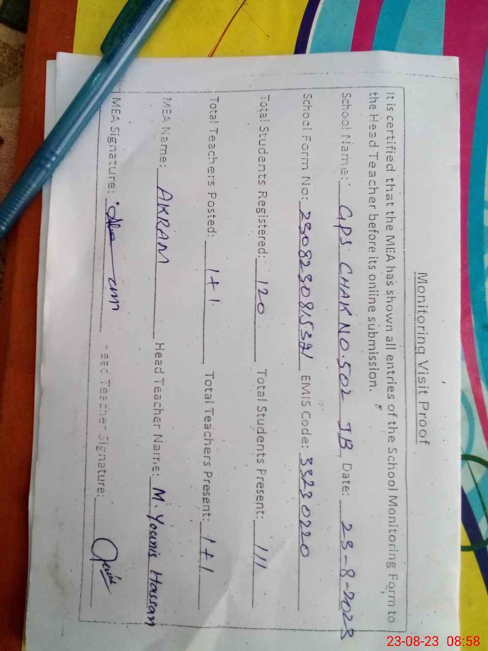 | EMIS Code: 33230220 | Name of School: GPS CHAK NO 502 JB | |||