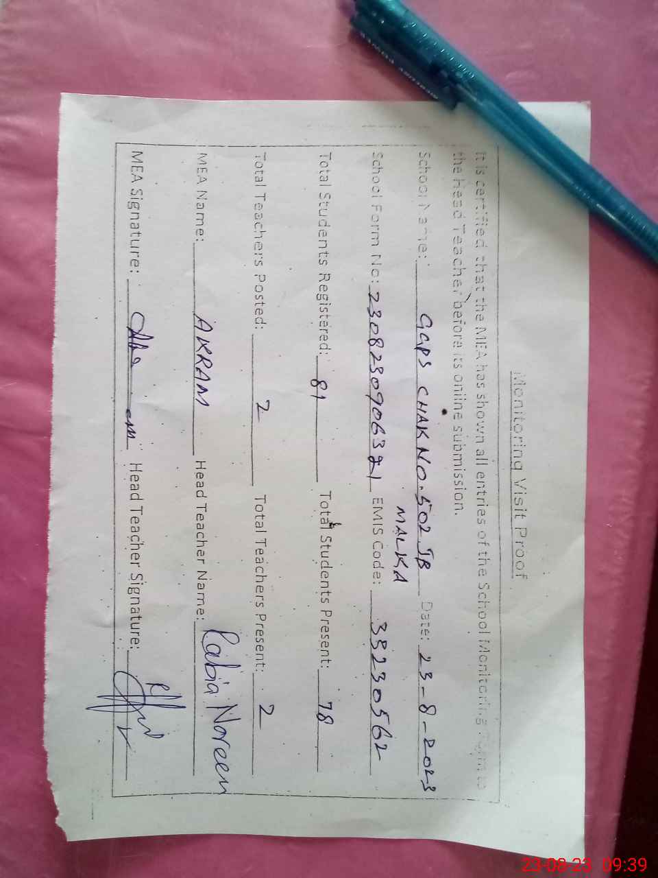 | EMIS Code: 33230562 | Name of School: GGPS CHAK NO 502 JB MALKA | |||