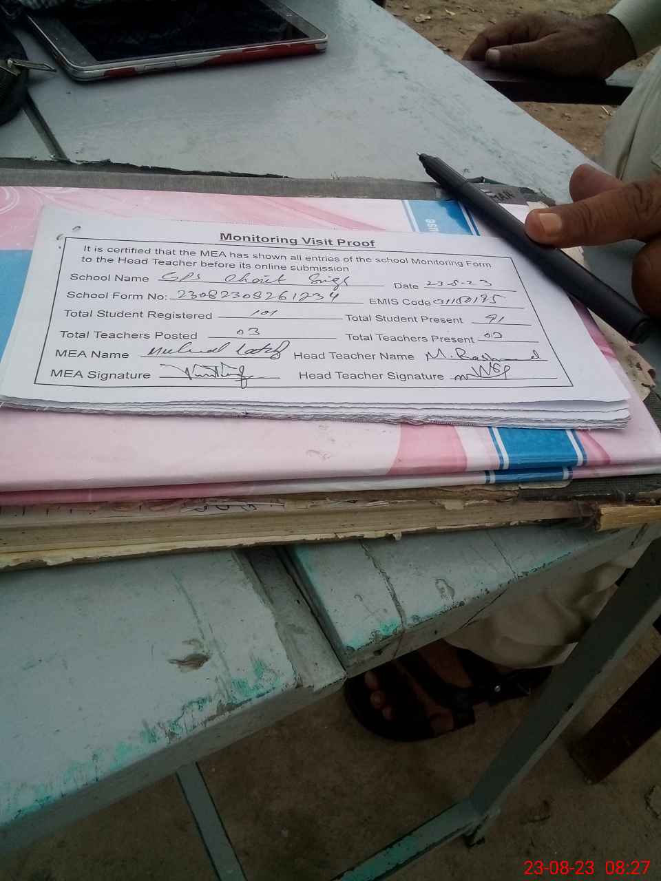 | Attendance Register | Head Teacher | MEA with School | Visit Proof |