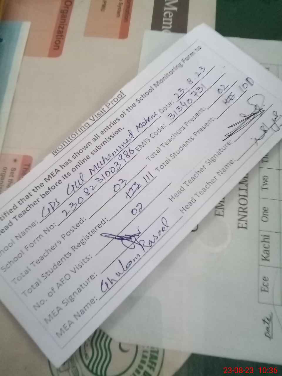 | Attendance Register | Head Teacher | MEA with School | Visit Proof |