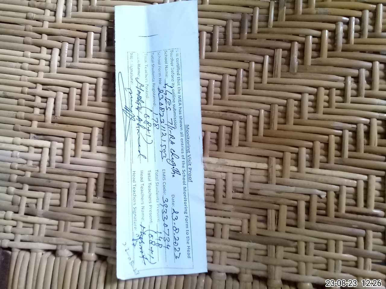 | Attendance Register | Head Teacher | MEA with School | Visit Proof |