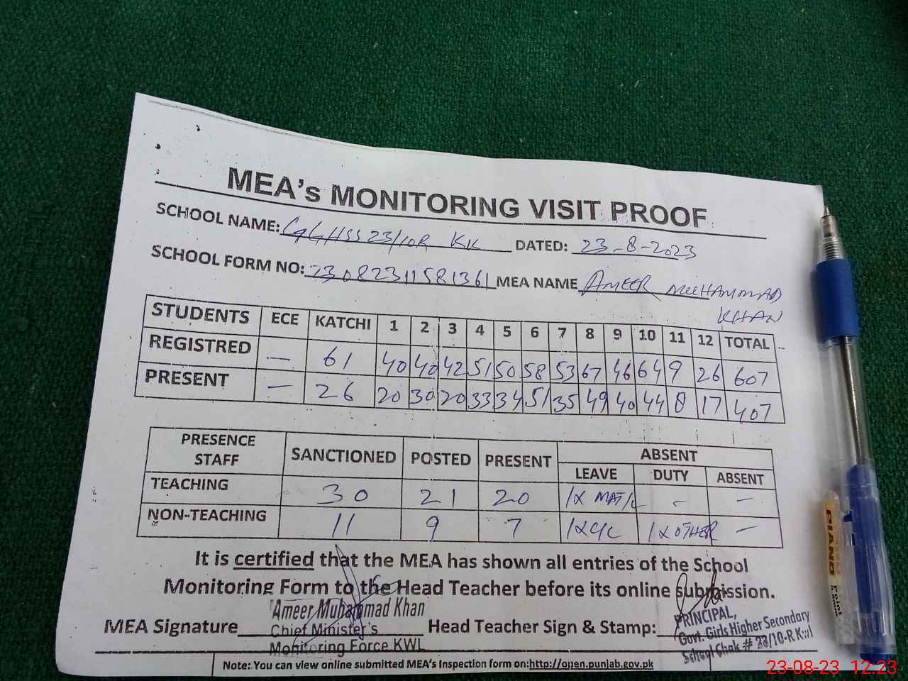 | Monitoring Date: 23-08-2023 | Start Time: 23-08-2023 11:15 AM | End Time: 23-08-2023 12:30 PM | Name of MEA: Am**** Mu**** Kh**** | |