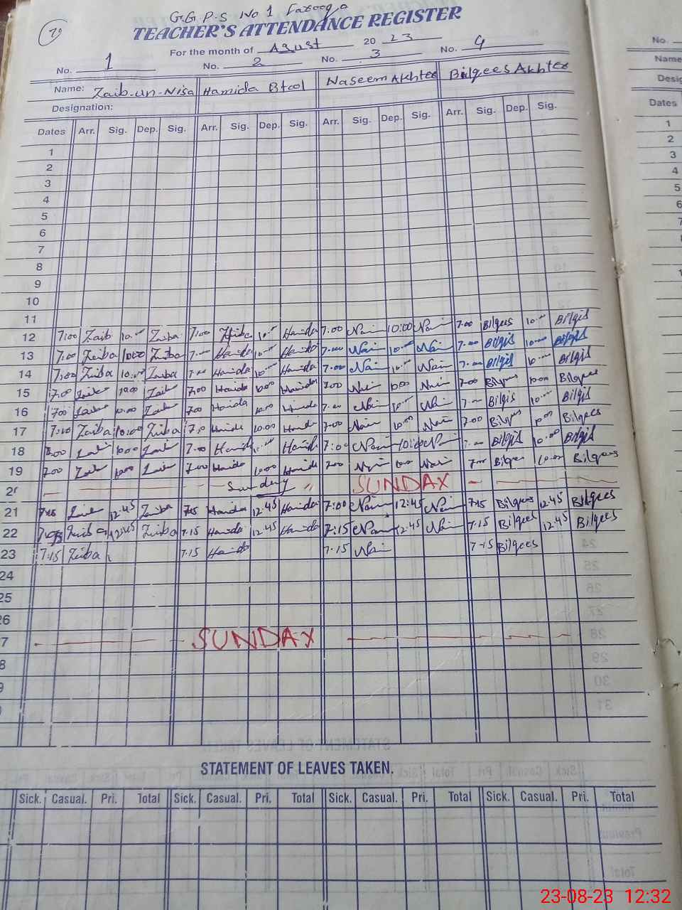 | CNIC | Full Name | Designation | R/C | Absence During Last Calender Month |