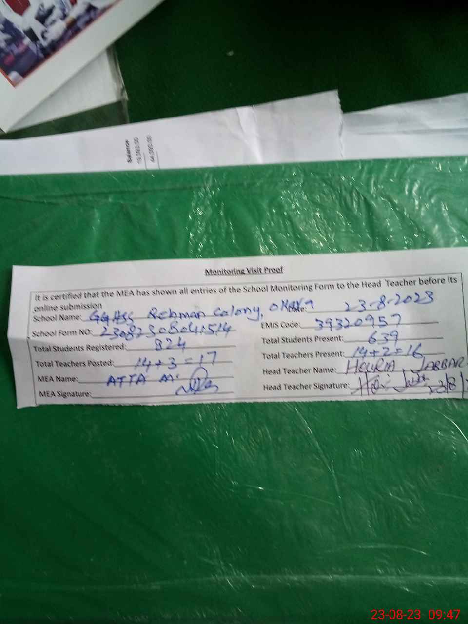 | Attendance Register | Head Teacher | MEA with School | Visit Proof |