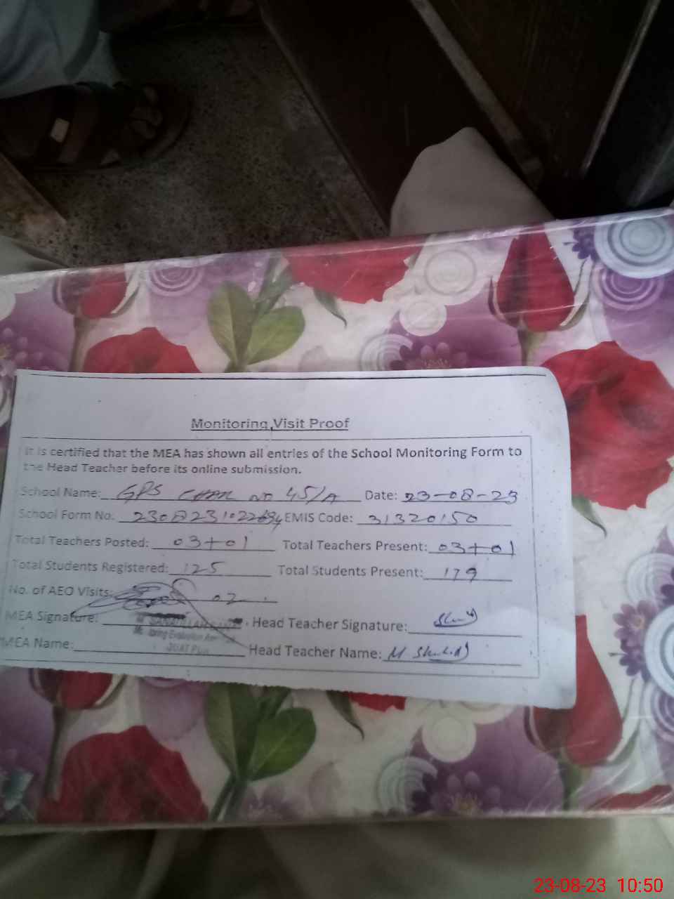 | Attendance Register | Head Teacher | MEA with School | Visit Proof |