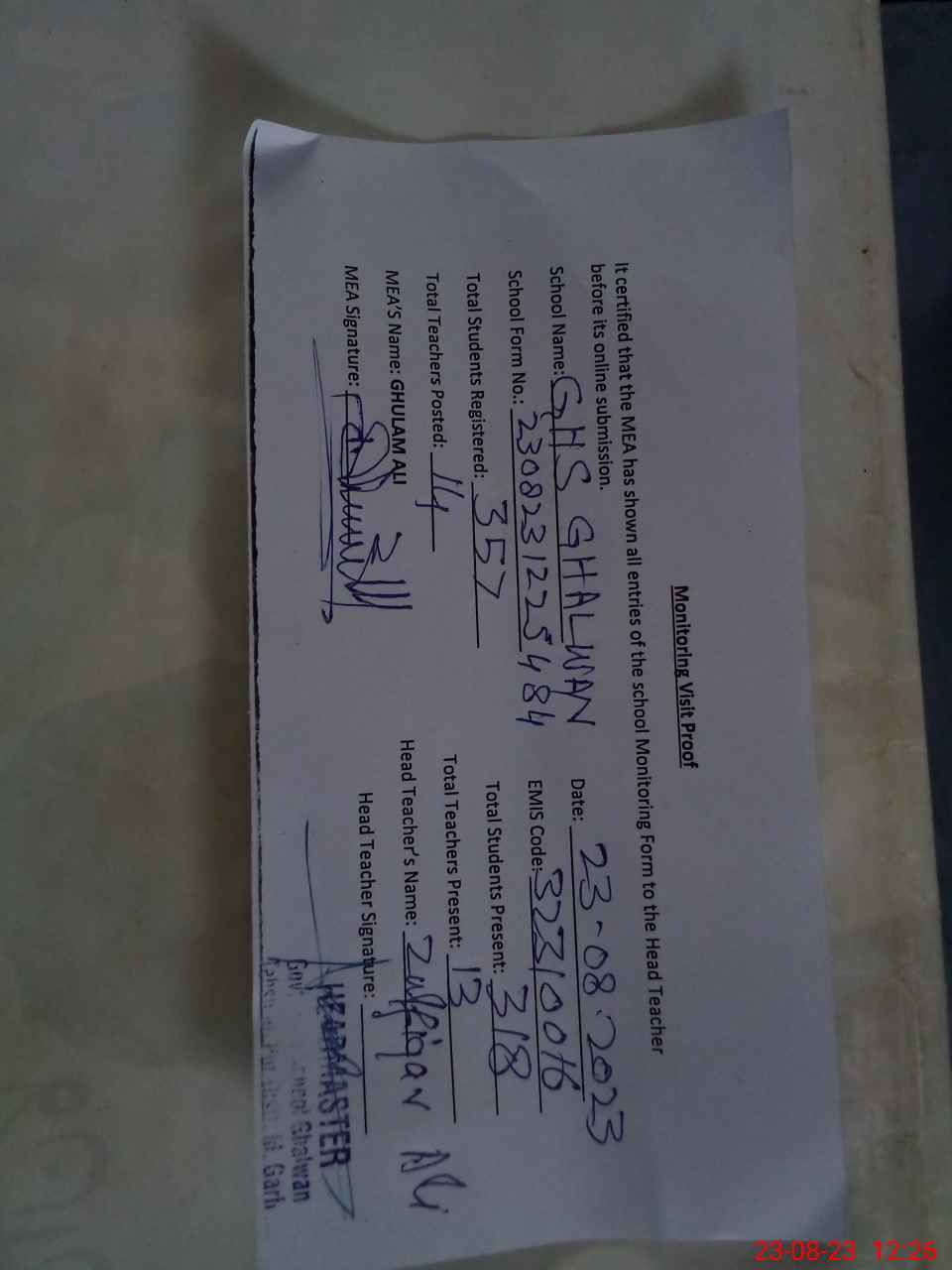 | Attendance Register | Head Teacher | MEA with School | Visit Proof |