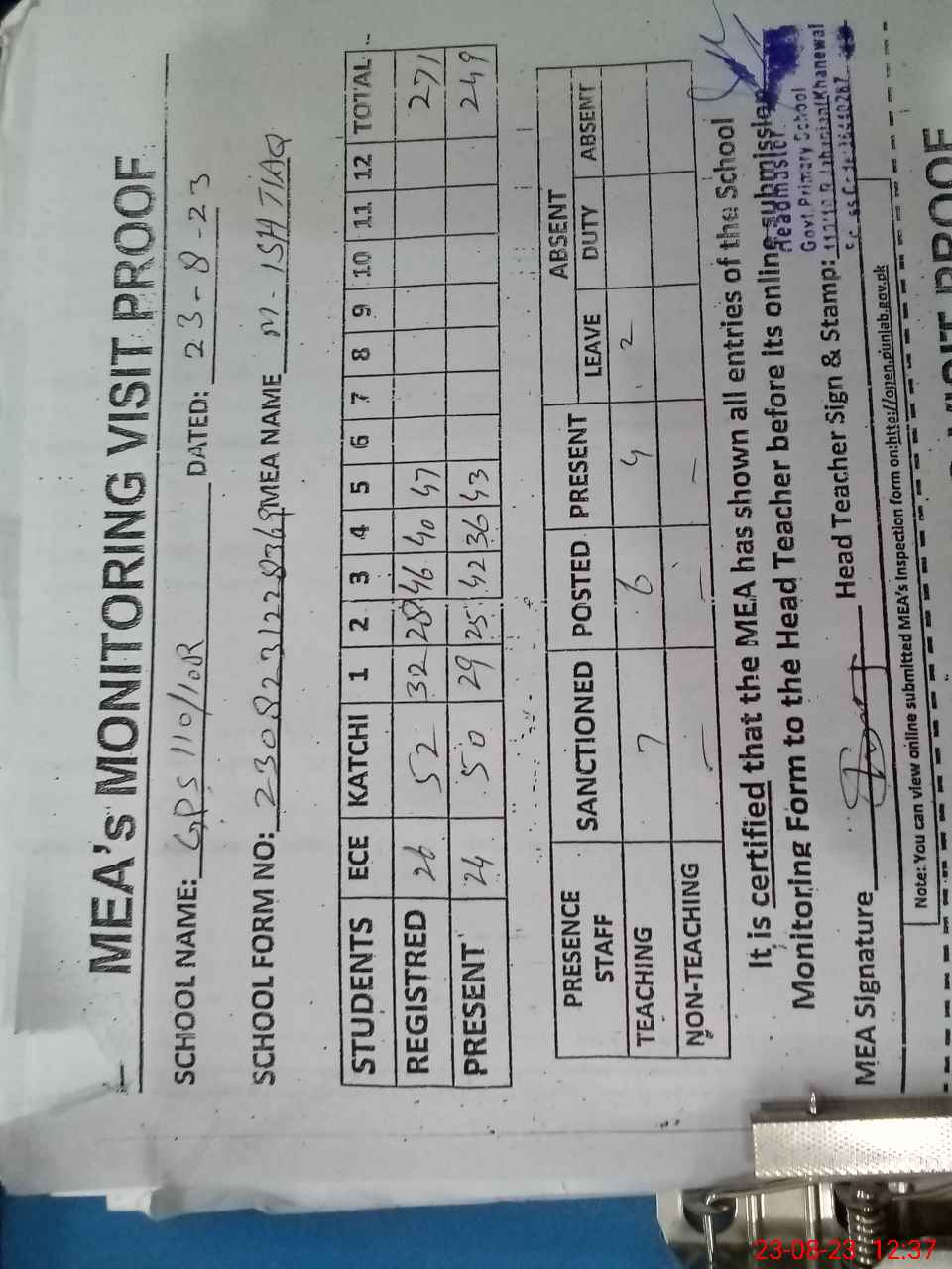 | Attendance Register | Head Teacher | MEA with School | Visit Proof |