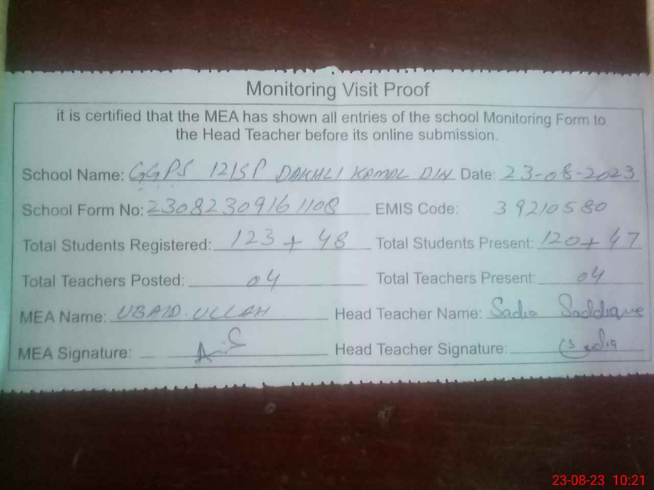 | Attendance Register | Head Teacher | MEA with School | Visit Proof |