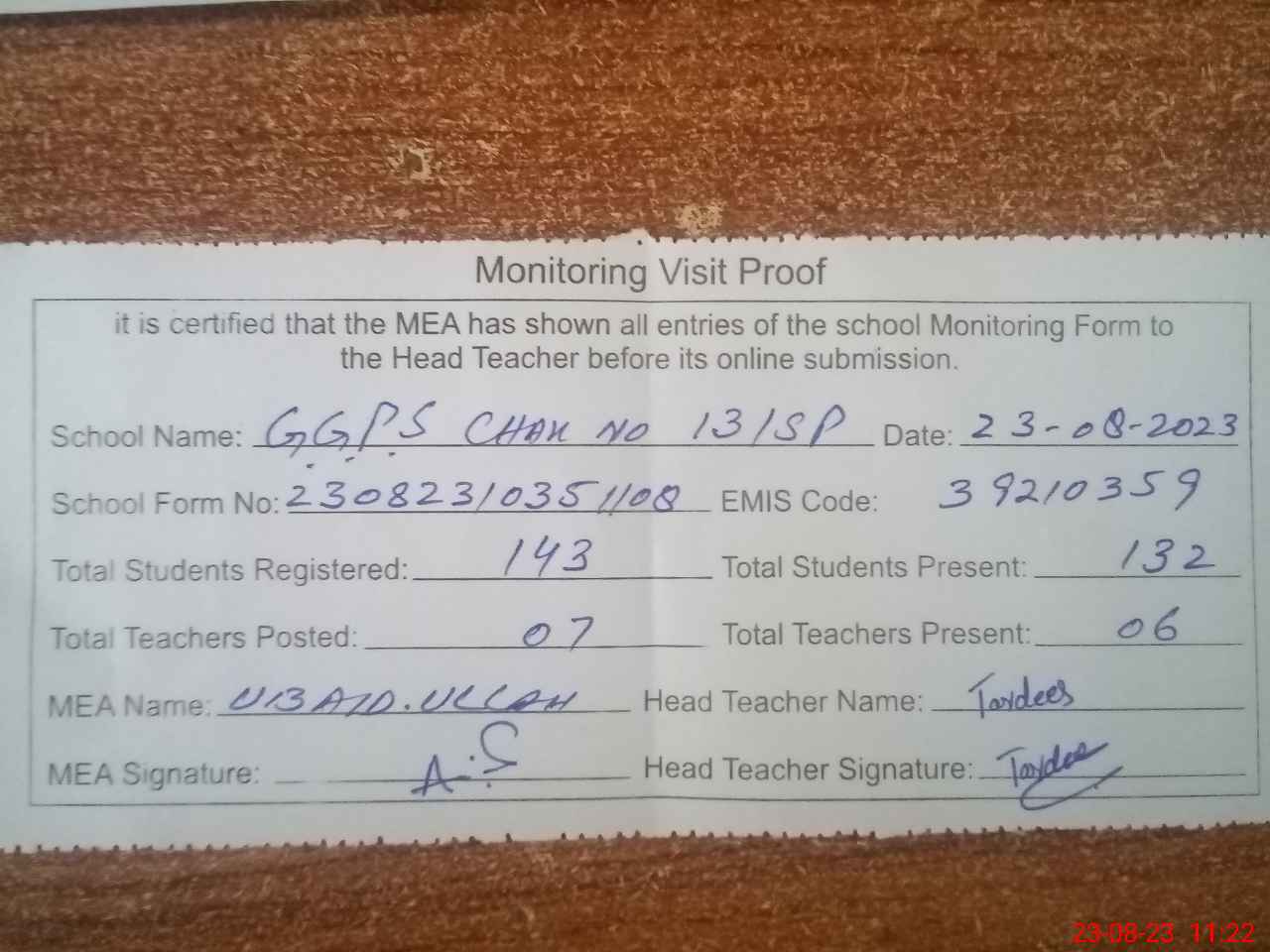 | Attendance Register | Head Teacher | MEA with School | Visit Proof |
